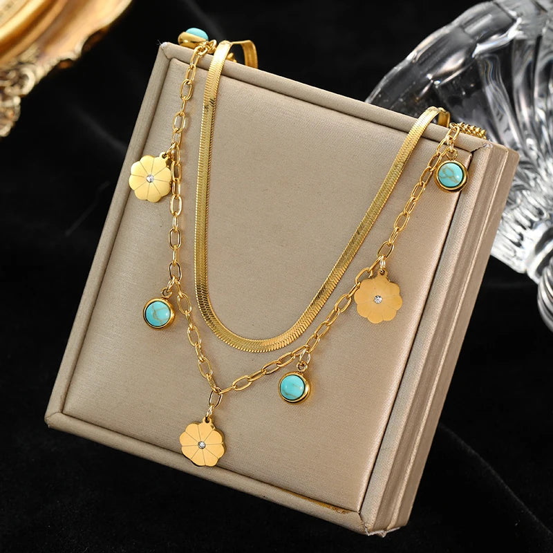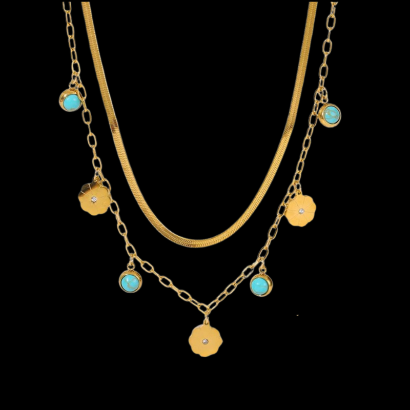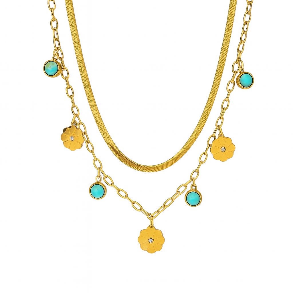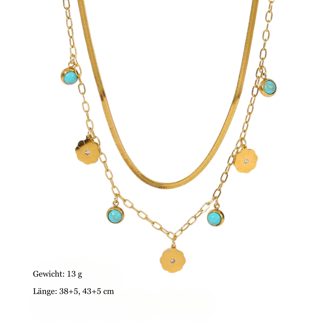 Die Halskette Mino vereint zwei feine, vergoldete Ketten zu einem stilvollen Schmuckstück. Zarte Anhänger in Blau und Gold setzen elegante Farbakzente und bilden einen harmonischen Kontrast. Hochwertige Vergoldung und modernes Design machen sie zu einem zeitlosen Highlight.